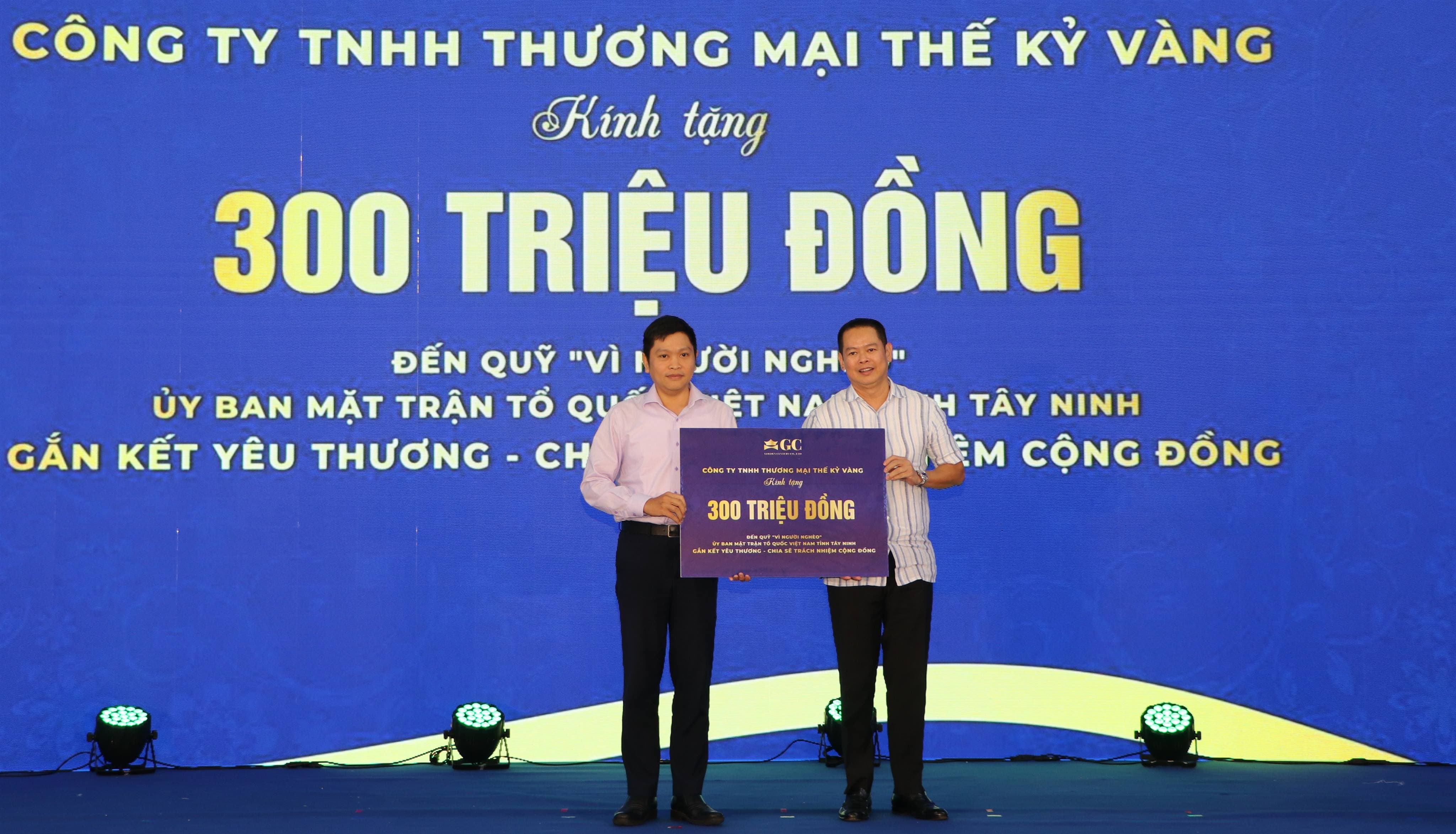 Đại diện Công ty Thế Kỷ Vàng trao bảng tượng trưng 300 triệu ủng hộ quỹ “Vì người nghèo” tỉnh Tây Ninh cho lãnh đạo Ủy ban MTTQVN tỉnh